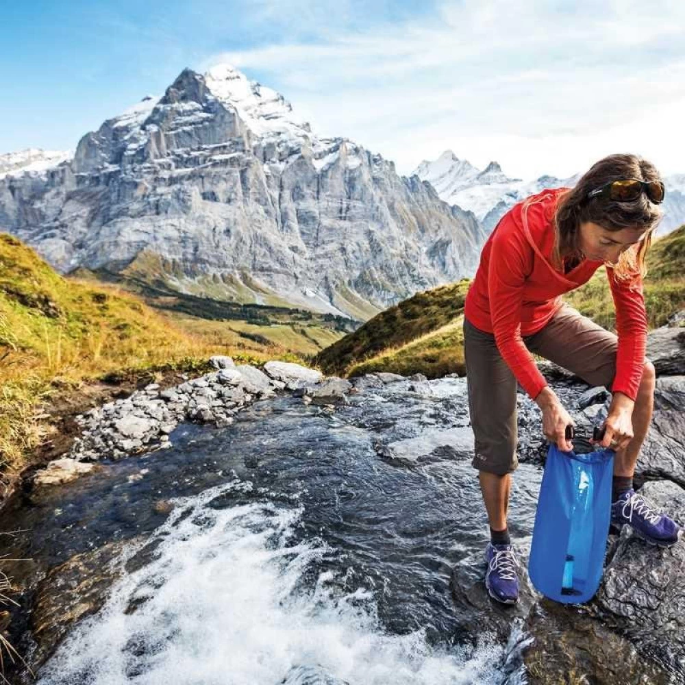 Le filtre à eau Katadyn Gravity Camp Pro garantit une eau pure sans effort : filtre par gravité. Autre avantage : il peut servir de douche de campement. C’est également une bonne solution pour la vaisselle. La capacité de 10 l du filtre Katadyn Gravity Camp Pro est adaptée aux besoins en eau d’une expédition en groupe. C’est un filtre pliable : volume plié de 27 x 15 x 7 cm. Poids léger : 350 g.
