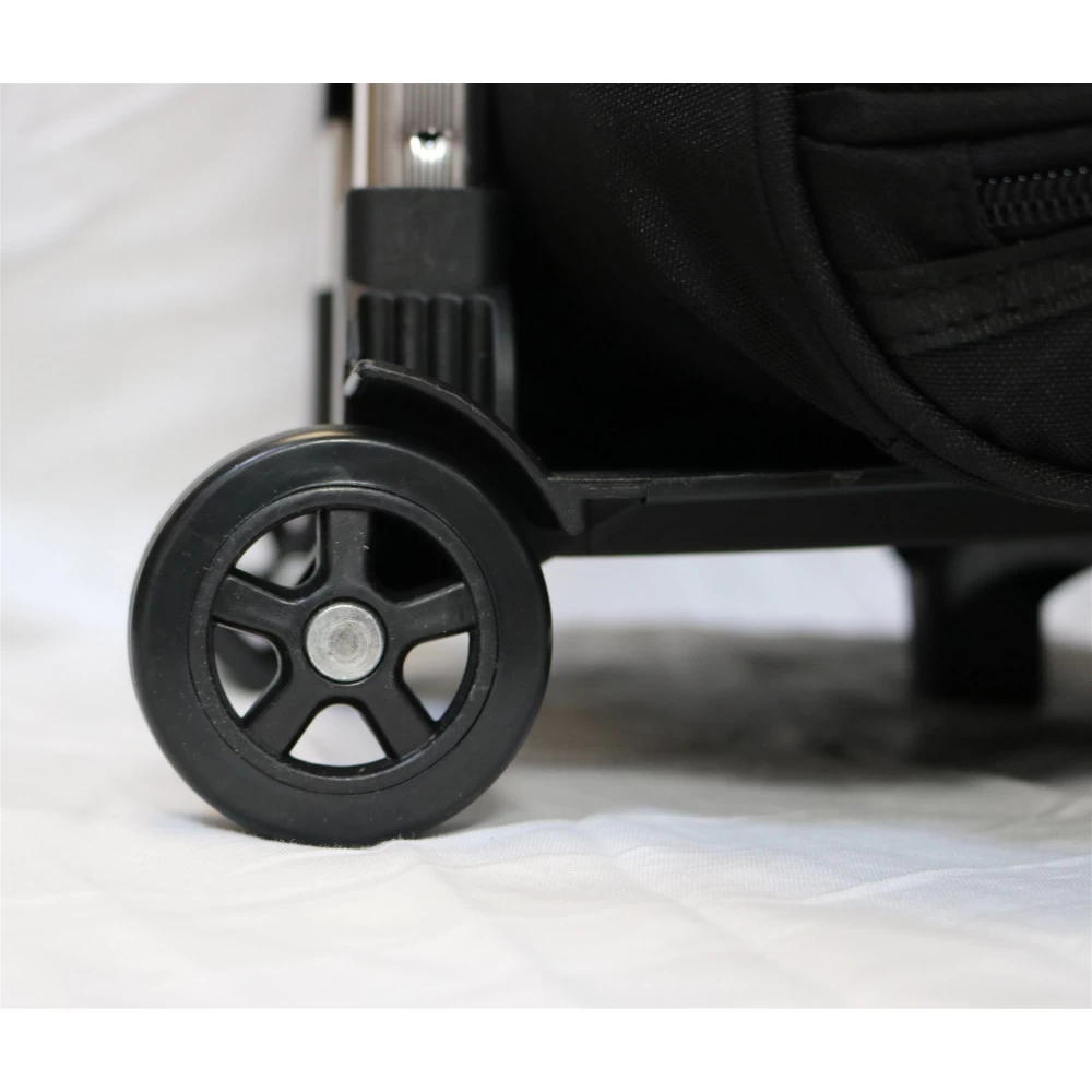 Fonction trolley : 1 poignée télescopique jusqu’à 42 cm, 2 roues et 2 pieds de support.